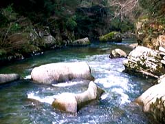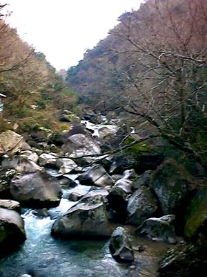 (W)下流方向を望む 渓谷の下流には、周囲2.5kmの高尾ダムが あって、魚釣りを楽しむことも出来ます。 |