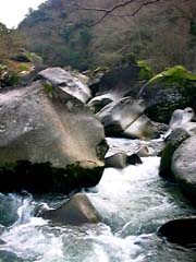 (Y)烏帽子岩 鬼の舌震には、この烏帽子岩をはじめ、 風化水食された文字通りの奇岩怪岩が 渓谷いっぱいに連なっています。 |