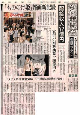 「もののけ姫」邦画新記録 配給収入72億円 宣伝、CM料換算で50億円に