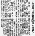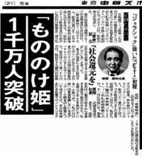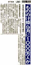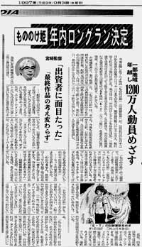 「もののけ姫」は七月十二日に封切られ、今月十一日までの観客数は九百六十五万人、配収は八十億円に達した。この三連休で約四十万人の観客動員が見込まれ、連休中の一千万人突破は確実となった。観客数では、児童、生徒が課外授業などで見た市川崑監督「東京オリンピック」(65年)の約千五百万人を除けば、邦画では最多。(当該記事より)