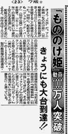 「もののけ姫」動員1000万人突破 今日にも大台到達!!