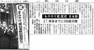 配給の東宝によると「もののけ姫」は、現在も全国約百九十館で異例のロングラン中。来春まで大都市を中心に上映を続け、配収百億円を目指すという。来年には欧米でも公開される予定。(当該記事より)