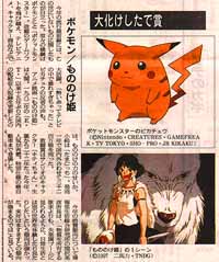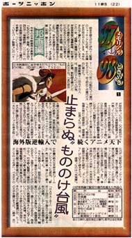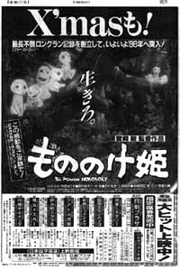 十三万五千枚の原画を使った映像美の素晴らしさとスピード感にひかれた観客も多いが、アニメファンの中心である低年齢層を意識しなかった難解な?ストーリー展開がリピーターを大量に生み出し、大ヒットにつながった。製作総指揮を務めた徳間康央・徳間書店社長(75)は「風、空、水、太陽の光を見事に描いた世界一の技術の映像と音楽が熱烈な恋愛をしで、最後まで突き進んだ。"生きろ"というキャッチコピーがヽ混迷の時代の中で一つの方針を生んだ」と豪語する。来夏には主役アシタカの声にレオナルド・ディカプリ才(23)を配しての英語吹き替え版が、欧米で公開。日本に逆輸入も予定されており、「もののけ姫」はさらなる広がりを見せる。