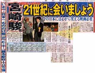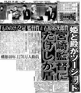 興行的ににふるわなかった北野映画も、理解あるスタッフに支えられ、ベネチアの栄冠にたどりついた。「もののけ姫」は宮崎監督が学生時代から40年近く構想を抱き続けてきた念願の作品。この日までに1270万人の観客を動員、配収100億円。「これを作らなければ、今までのことがうそになる」との決意がヒットに結びついた。