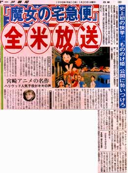 「今回の放送は『もののけ姫』全米公開に向けての前哨戦と考えています」と「もののけ姫」の鈴木敏夫プロデューサー(49)。宮崎監督が主宰するスタジオ・ジブリは96年、米ディズニー社と業務提携。「もののけ姫」の全米公開に全面協力するディズニーが、すでに熱狂的ファンが存在する"ハヤオ・ミヤザキ"の名を、より浸透させるために選んだ手段が、「魔女−」のテレビ電波を使った"宅急便"だった。昨年末には英語吹き替え版も完成。主役キキの声は日本でも大ヒットした映画「ジュマンジ」「インタビュー・ウィズ・ヴァンパイヤ」などで知られるハリウッドの人気子役、キルステン・ダンスト(15)が演じている。10月には英語吹き替え版ビデオの発売も決定。「魔女」と「もののけ姫」の最強タッグがアメリカ中に宮崎旋風を巷き起こす。