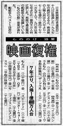 会見した映連会長の松岡功東宝会長は、「『もののけ姫』の大ヒットと、設備の良い映画館が増えたのが好調の理由。日本映画が健闘した年」と位置づけ、久しぶりに明るい表情。「もののけ姫」の百億円突破で、映画の配給収入全体のうち邦画の占める割合が40%を超えた。(一昨年は36%)という。