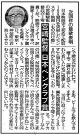 日本映画史上初めて配収100億円を突破したモンスター映画「もののけ姫」の宮崎駿監督(56)=写真=が、 映画ライター、評論家191人が選ぶ日本ペンクラブ賞を受賞。5日、東京・神保町の岩波シネサロンで贈呈式が行われた。