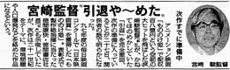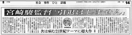 アニメーション映画「もののけ姫」で配収百八億円という空前の大ヒットを飛ばした宮崎駿監督(57)が、かねてほのめかしていた「引退」を完全撤回、自作の準備に入っていることが27日、関係者の話で明らかになった。