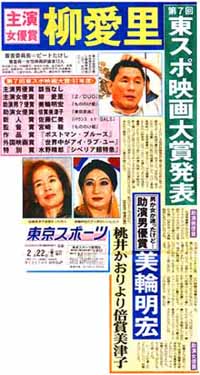 ビートたけし本紙客員編集長が選ぶ東スポ恒例の第7回東京スポーツ映画大賞が20日、決定した。役所広司、桃井かおり(主演賞)一色の他の映画賞に対して、たけし審査委員長は、主演男優賞は「該当なし」。同女優賞に『2/DUO』の柳愛里(ゆう・えり)を選んだ。また、「助演男?優賞」として『もののけ姫』の声優に挑戦した美輪明宏。新人賞に「ぶん殴りたくなるコギャルを見せた」佐藤仁美など、たけしならではの選考となった。なお授賞式は3月13日、都内のホテルで行われ、本社から豪華トロフィーと賞金が贈られる。