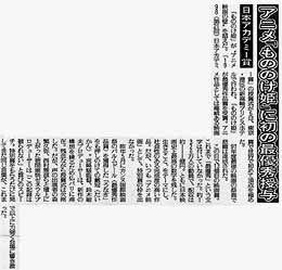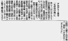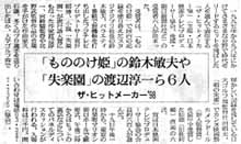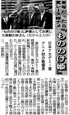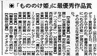 「もののけ姫」がアニメ作品としては初めて最優秀作品賞に選ばれた。同作は現在配収111億円と日本記録を更新中。宮崎駿監督は次回作取材のため、パリ、サハラ砂漠を旅行中という。(当該記事より抜粋)