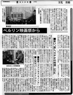 第48回ベルリン国際映画祭は先月11日から22日まで12P日間、華やかに催され、ブラジル映画『セントラル・ステイション』がグランプリ(金熊賞)を獲得して幕を開じた。日本映画は国際コンペ部門で『もののけ姫』が招待上映され、そこで賞を争った『SADA』(大林宣彦監督、松竹)が映画祭の公式の賞こそ逃したものの、国際批評家連盟賞に輝いた。特に『ラヂオの時間』が圧倒的な人気を博し、また『アンラッキー・モンキー』『青い魚』『パーフェクト・ブルー』などが、国内では想像もできないような話題を呼んでいた。日本映画は海外でどのように受け取られるのか。ベルリン映画祭で感じたことをまとめでみた。(松島利行=映画評論家、帝京大学講師)