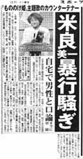 カン高い不思議な歌声で魅了してきた米良。だがカウンターテナーならぬカウンターパンチを繰り出すとは…。あの美声からはちょっと想像できない野蛮な騒動を起こしていた。開係者の話を総合すると、昨年10月、米良が東京・杉並区の白宅から都内の宅配ボーイクラブに電話をかけてゲイボーイのあっせんを頼んだのが事の発端。好みの体形や年齢などを業者に伝え、数時間後、20代代のゲイボーイがやってさた。ところが、米良は「僕が伝えた条件と連う」ど逆上。ゲイボーイの顔などにパンチをたたさ込んだという。