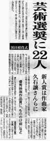 芸術選奨に22人 新人賞は作曲家久石譲さんらに