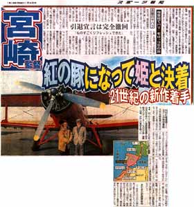 宮崎監督は自身の監督作「紅の豚」(92年)に登場させたようなクラシックな複葉機でパリからモロッコまで飛行。「やっと『もののけ姫』に決着が着いた。ものすごくリフレッシュできました」と、すぐにも新作にとりかかる。