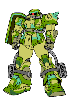 CAMOUFLAGE COLORSThough externally identical to the C- and F-type Zaku II, the J type was a specialized land combat version. Omitting all space-specific systems, the J type was lighter and more agile than its spacegoing kin, and soon became the backbone of Zeon's Earth Attack Force. Popular options included leg-mounted missile pods, a handheld version of the Magella Attack tank's 175mm cannon, and a variety of camouflage paint schemes.