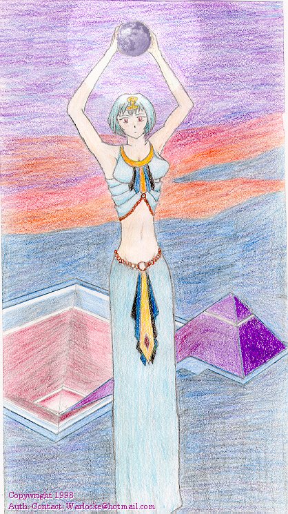 as an Egyptian holding the moon in front of NERV HQ
