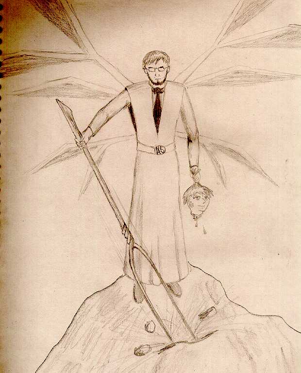 Gendou displaying his wrath and Kaworu's head
