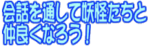 ![]() Converse with the Yookai to make them your friends! Click on the Yookai to make them respond to you. If you wake them up when they're sound asleep, though, they may be mad and thus dangerous. Your best bet is to get along with them, since they are Yookai, after all. |