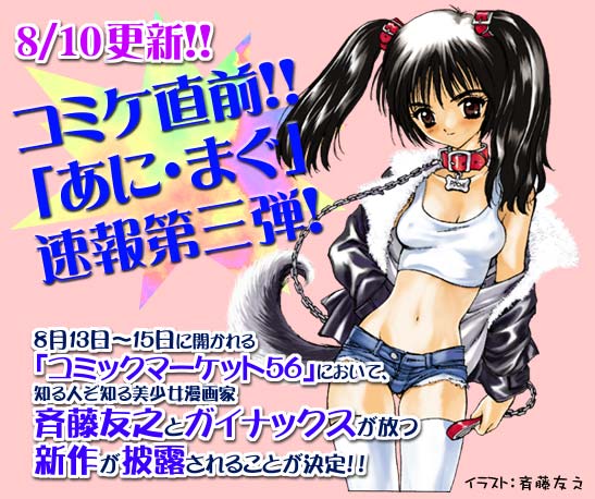 | A popular manga artist in his own right, Saito operates the Saito Group at Comic Market, together with Utatane Hiroyuki. Many of his fans lament the fact that they can't often find new works by Saito, due to the fact that he does most of his work in dojinshi circles. But something new is coming at last, so stay tuned, whether you know his work or not. |