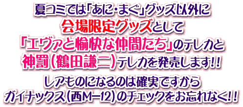 We'll have telephone cards for Eva and Good Friends and Shimbatsu (Divine Retribution, by Tsuruta Kenji) as well as Animag merchandise at Comic Market, all available nowhere else. If you're there, check out Gainax's booth (M-12) for merchandise sure to become collector's items.