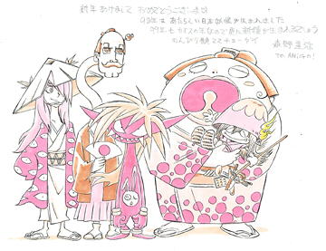 ¥Fujita Yukihisa(Manga Artist, Illustrator) This year, GAINAX will release "Choki-Choki Land (Snip-Snip Land)", a collection of my artworks on CD-ROM. This will mark the beginning of my earning royalties on computer! But if it doesn't sell, then my entry into the PC arena will be postponed indefinitely...and you'll never get to see my art. So to all of you who are reading this, kindly consider yourselves volunteers in this effort, and please give me your support! ¥Masayuki (Animator, Animation Director) Happy New Year. ¥Mizuki Waka(Manga Artist) Happy New Year. There've been numerous delays with my CD-ROM, causing the GAINAX people much inconvenience. (^^;) My apologies. These delays were the result of my getting overly wrapped up in what I was doing. I'll try harder next year, so please let me off the hook this time. ¥Marchen Maker (Manga Artist) Happy New Year. My occupation at present is "housewife and lady of leisure". I've retired altogether from manga...Actually, no, I didn't really want to give it up, so I'm doing some occasional work here and there. You might see me in SO-NET's Story-Gate this year. ¥Morino Tatsuya (Manga Artist) Happy New Year. 1998 saw the birth of new Japanese Yookai. And as 1999 is supposed to be a year of chaos, there may be even more new ones born this year. Observe them at your leisure.