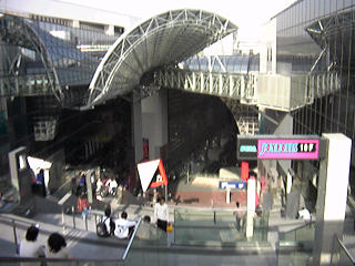 | Japan Railways' Kyoto Station is itself one gigantic piece of art that gets my dander up. This view is from the highest point on the main staircase, looking down. Why didn't they put a roof over the whole thing? Are they trying to tell people to stay away from here on rainy days? Do they even understand what it means to be a public place? It's things like this that turn old cities into new and dull cities. I hope it holds on for a thousand years. Then maybe the people of Kyoto will have reason to be proud of it. In the meantime, I'd suggest that JR think long and hard about the fact that they're using Kyoto's ancient and classical stature to promote it as a travel destination. |