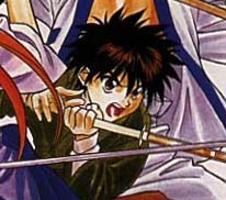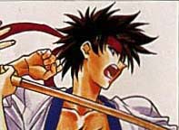Age 28 (but doesn't look it at all). He has red hair gathered in a ponytail and a scar like a cross on his left cheek which is how people can tell he is the infamous "Hitokiri Battousai" (roughly translates to something like Drawn Sword Assassin). He got this name during the upheaval before the Meiji Restoration, when his fighting skills were unsurpassed. What his reputation as Battousai doesn't include is his very short height and slightly feminine voice, which often makes his opponents underestimate him. After the start of Meiji in the 1800s, he gave up his assassin ways and became a "rurouni" or wanderer, helping people to atone for all the people he had killed. He carries a "sakabatou" (a sword with the blade reversed so he cannot kill his opponents, only knock them unconscious) because he has vowed to himself never to kill again and uses the sword technique called "Hitenmitsuryugiryuu" ("Strike of the Flying Dragon" Bill claims, "Flying Heaven's Honourable Sword Flow" as said by Owain). He is often chased by police for carrying a sword, were outlawed during the Meiji. Kenshin has a very gentle and polite nature (refering to himself as "sessha" which roughly means "this clumsy person", and using the polite verb "gozaru" at the end of his sentences) with a strong sense of right and wrong. One of his common sayings is "Oro" a version of "Ara". However, this nature could be a mask for his violent hitokiri nature which seems to resurface whenever he is faced with a tough opponent or other extreme circumstances. In these instances he seems almost superhuman in his fighting ability, almost as if he were a different person, and also reverts to regular casual speech, using "ore" instead of "sessha" is one of the ways Kaoru realized Kenshin was not his normal easygoing self during the fight with Jine. I think his struggling to deal with his hitokiri nature makes him the most interesting character of the series which I guess is why I am writing so much about him in this description.