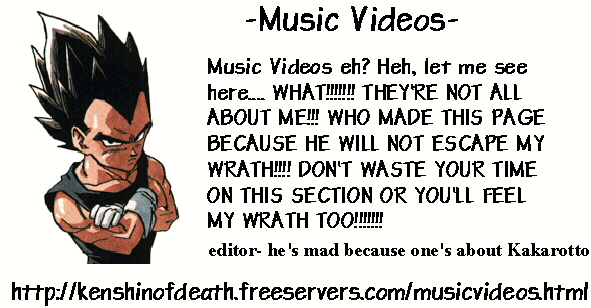 Well then, I suppose we shall look at these music videos shall we? I have a very small music video collection right now but I can assure you they are 100% original. I did not steal them from anywhere and I expect no one to steal them either. The only other place that should have some is Vegeta Insane because I will make some of these for both sites. Also, if my music vids aren't enough for you go to Vegeta Insane For ALOT of top quality music videos. This is where I was inspired to make music videos from. Most of my music videos will be in Real Player format so get one if you don't have it. There are some mpeg files also. Feel free to send me music videos! I will also have files on freediskspace.com and they only let you download if you're a member, so if you're not then sign up! These files can be indentified because they have FDS next to the "Download "" Version". Here's how the pages work. This new releases page will hold the 5 newest music videos no matter what type they are. The archives will hold 8 music videos each. If you want to put -one-(notice the word ONE) of these music videos on your page, feel free. Just make sure you upload it to your own server and you notify me first so that I know where my music videos are. Anyway, on to the music videos.